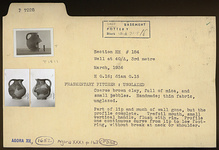 | Description: | Part of lip and much of wall gone, but the profile complete. Restored in plaster. Trefoil mouth, small vertical handle, flush with rim. Profile one continuous curve from lip to low foot ring, without break at neck or shoulder. Coarse brown clay, full of mica, and small pebbles. Handmade; thin fabric, unglazed. | |