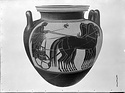 Description:   Mended from many pieces; about three-quarters of the neck and rim, fragments from the walls, and all of the base missing. Many of the parts do not join. Traces of burning. Inside unglazed except the neck. Lip flat on top, reserved; purple line inside; outer edge moulded in three degrees, upper and lower purple, middle reserved. A moulded ring, purple, at the base of the neck, and two purple lines around the body below the figured panels. Double horizontal handles rising vertically from the shoulder, the attachments of both preserved, and about half of one handle. Front and back panels repeat the same scene, framed above by a tongue pattern: two youths, right, in a quadriga. Both wear himatia. The nearer figure drives, holding reins and whip; the farther figure rests his left hand on the chariot rail. In the field above, a bird flies left. Incision. Purple on ears and manes of all horses; tails of two; parts of harness; two bands on chariot; fillets of youths, and border of himation.