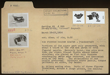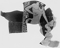 Description:   Portions of the upper part only preserved, with about one-third of the rim and parts of both figured panels. Severely burnt, one side more than the other. Glazed inside except under shoulder; rim glazed on flat top; concave overhanging outer edge reserved, and decorated with an ivy band. The attachments of one handle preserved. Borders: above panels, tongue patterns; at sides, ivy bands.