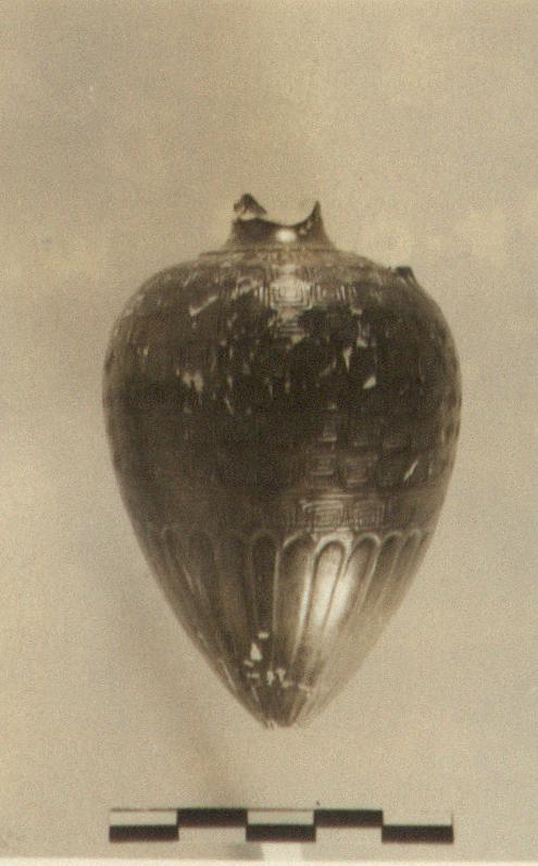 | Description: | Neck, handles, and base missing. From base: long round-ended petals; then, on upper body, eight rows of stamped maeander sections. On shoulder, round-ended petals, reversed, below a small cable. Good blue-black glaze, slightly chipped. | |