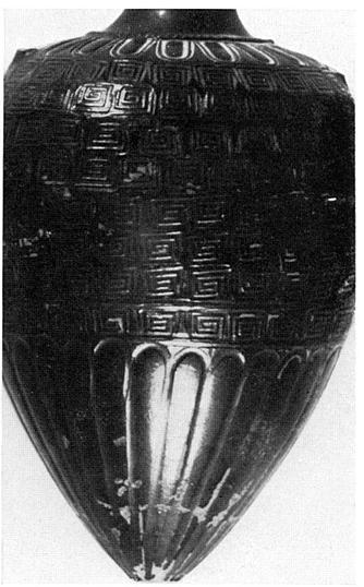 | Description: | Neck, handles, and base missing. From base: long round-ended petals; then, on upper body, eight rows of stamped maeander sections. On shoulder, round-ended petals, reversed, below a small cable. Good blue-black glaze, slightly chipped. | |
