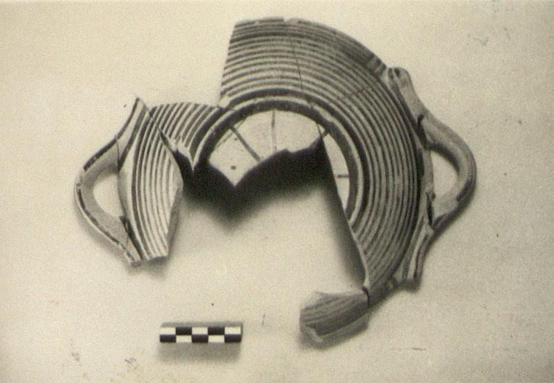 | Description: | Fragments of base, wall and rim missing. Restored in plaster. Low ring foot and horizontal handles applied to rim, which is flat on top. Outside, bands. Inside the foot, beneath, a ring and an eight-armed cross. Stroke series on upper face of rim. Horizontal triple bands on handles. Inside, dull black glaze. | |