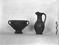 | Description: | Small slender oinochoe; trefoil lip; ribbon handle. Outside glazed all over save for shoulder band with two narrow stripes top and bottom; in shoulder band: diminishing triangles and star; handle striped. Attic clay. Brownish-black glaze. The slender shape is unusual and apparently early. | |