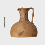 | Description: | Base and lower part of body and handle missing. Several small fragments do not join. Straight neck and trefoil mouth. On body, triple reserved bands, and a band of linked concentric semicircles on shoulder. Two more similar bands at upper and lower edges of neck. Between, hatched maeander, left. In panel on front below neck, five dotted concentric circles. On edge of lip, vertical hatching. Bluish-black glaze, peeled. | |