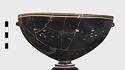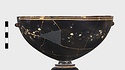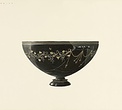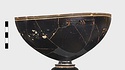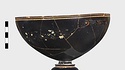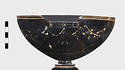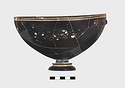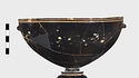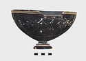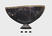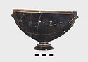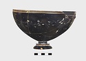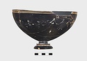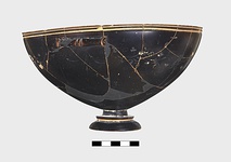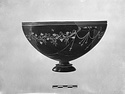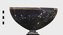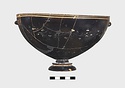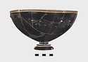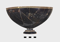 | Description: | Mended from many pieces; a few small fragments of the wall, and one of the lip, missing. Open hemispherical bowl on tall moulded foot. Beneath lip on outer wall, two grooves. Beneath these grooves, on opposite sides of the pot, moulded lugs. Around the wall an elaborate grapevine garland in applied clay; above the vine, a painted inscription, spaced around the vase: Δ Ι Ο Ν Υ Σ Ο Υ Glossy black glaze, scratched from grooves beneath lip, and from one around and one under foot. Traces of stacking on floor. | |