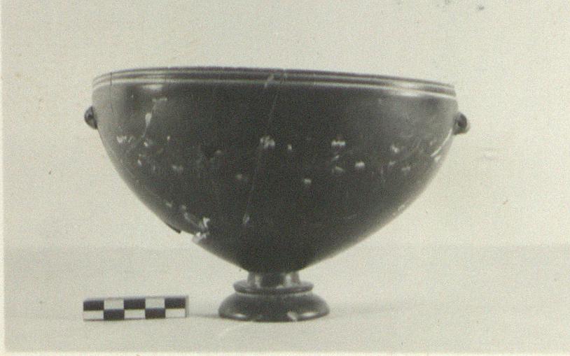 | Description: | Mended from many pieces; a few small fragments of the wall, and one of the lip, missing. Open hemispherical bowl on tall moulded foot. Beneath lip on outer wall, two grooves. Beneath these grooves, on opposite sides of the pot, moulded lugs. Around the wall an elaborate grapevine garland in applied clay; above the vine, a painted inscription, spaced around the vase: Δ Ι Ο Ν Υ Σ Ο Υ Glossy black glaze, scratched from grooves beneath lip, and from one around and one under foot. Traces of stacking on floor. | |