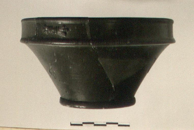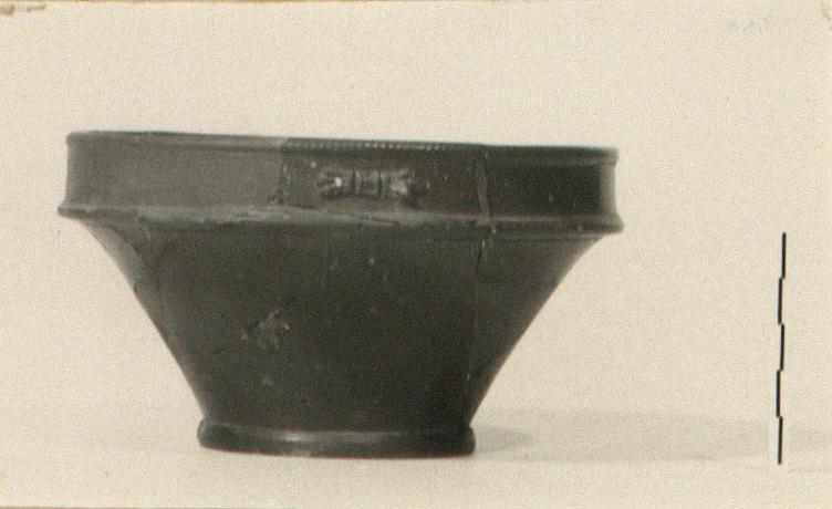 | Description: | Ring foot; keeled rim broken off. Restored in plaster. At center of floor, foot-shaped stamp: <graphic> | |