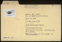| Description: | Chip missing from lip. Wide shallow ring foot. Incurving rim. Heavy fabric. Fair black glaze over all except on resting surface. | |