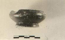 | Description: | Chip missing from lip. Wide shallow ring foot. Incurving rim. Heavy fabric. Fair black glaze over all except on resting surface. | |