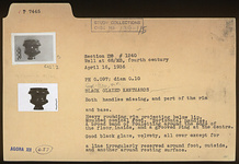 | Description: | Both handles missing, and part of the rim and base. Heavy rounded rim projecting below lip. Moulded conical foot. Horizontal handles. A broad band of rouletting around the edge of the floor inside, and a grooved ring at the center. Good black glaze, velvety, over all except for a line irregularly reserved around foot, outside, and another around resting surface. | |