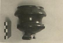 | Description: | Both handles missing, and part of the rim and base. Heavy rounded rim projecting below lip. Moulded conical foot. Horizontal handles. A broad band of rouletting around the edge of the floor inside, and a grooved ring at the center. Good black glaze, velvety, over all except for a line irregularly reserved around foot, outside, and another around resting surface. | |