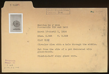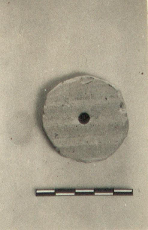 | Description: | Circular disk with a hole through the middle. Cut from the side of a pot decorated with glaze bands. Pinkish-buff clay; glaze worn. | |