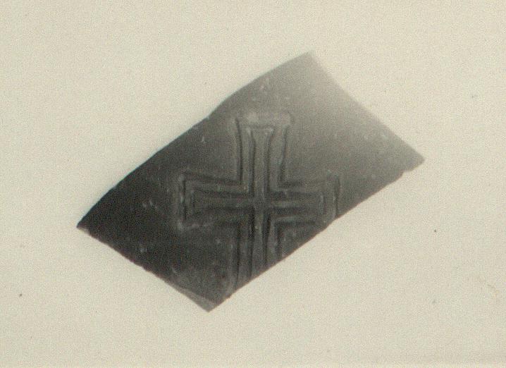 | Description: | Fragment from center of plate. Stamped with cross; part of one arm of cross broken away. Red clay. Thin red wash inside. Late Roman C Plate. | |