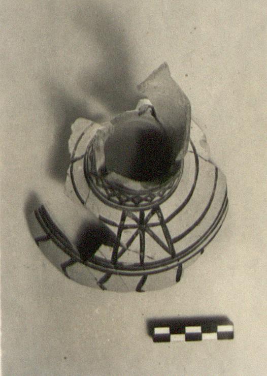 | Description: | Part of neck and shoulder preserved with start of trefoil mouth. Partly restored in plaster. Around bottom of neck, horizontal row of dotted lozenges between bands. On shoulder, two bands with an eight-armed cross in a panel at the center; below, three bands; on body, vertical zigzags, widely spaced. Pinkish clay with some white bits; creamy slip. Dull black glaze. Attic? | |