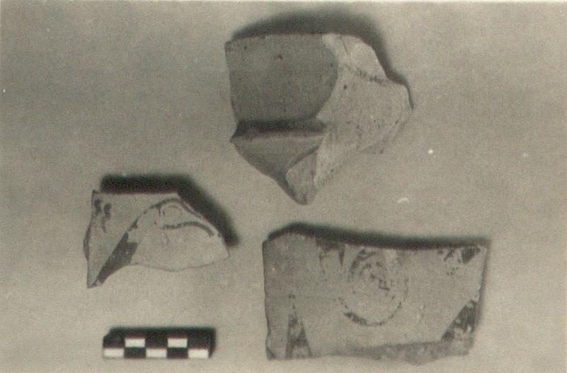 b) Body fragment. Head and neck of a large bird, right, the head drawn in outline. Zigzag filling ornament.