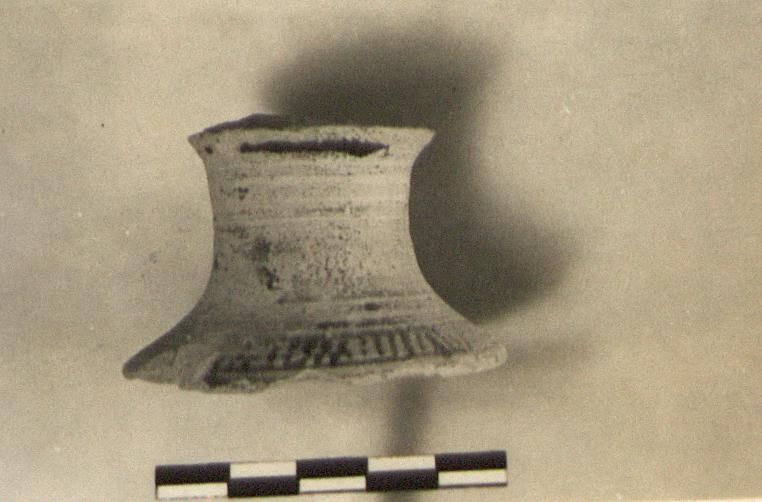 Description:   Small flaring hollow base, broken off at its junction with the pot. Wide and narrow bands to near edge; edge decorated with parallel vertical strokes.