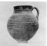 | Description: | Similar to P 7533 (ΠΘ 1354), but larger, and the body more as P 7531 (ΠΘ 1349). Wheel run grooves and ridges. Black to red glaze, well preserved. | |