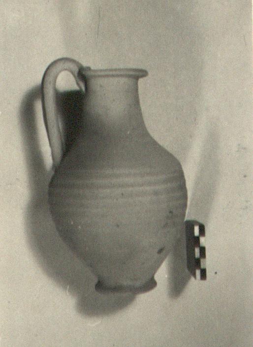 | Description: | Ring foot and round mouth with projecting lip grooved on the top, and indented at the handle attachment. Shallow grooves to shoulder; handle grooved. Pinkish-buff clay; buff surface; unglazed. | |