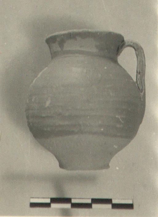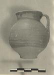 | Description: | Flat-bottomed jug, the bottom smoothed. Similar in shape to P 7533 (ΠΘ 1354), but with the mouth narrower in proportion and the lip sharply flaring. Good red glaze, except around the bottom; chipped in places. | |