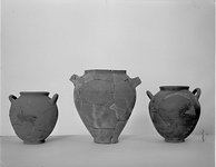 | Description: | One handle missing. Plain rounded lip, wide mouth; rounded body, ring foot. Micaceous red clay with grits. Traces of red glaze; most of glaze, and much of surface, peeled off. | |