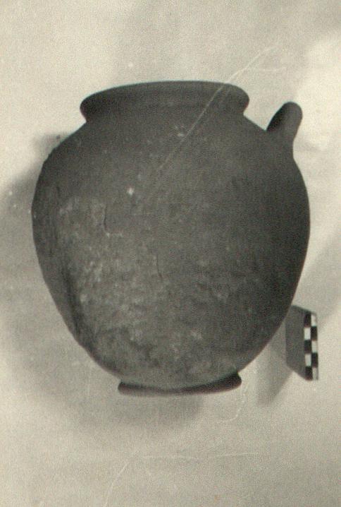 | Description: | One handle missing. Plain rounded lip, wide mouth; rounded body, ring foot. Micaceous red clay with grits. Traces of red glaze; most of glaze, and much of surface, peeled off. | |