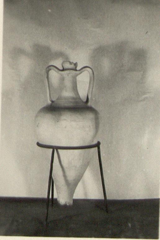 | Description: | Lip and foot chipped. Turnip-shaped body ending in a hollow ring; narrow neck, slightly thickened at lip; handle ridge and wide ridged band handles. Gritty buff clay; creamy surface. | |