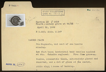 | Description: | Ribbon-handled plate. Rim fragments and most of one handle missing. Low flat base; horizontal band handles applied at rim. Outside unglazed. Five fine grooves. Inside, concentric bands, alternately glazed and reserved, and a dot of glaze at the center. Attic clay, traces of burning. | |