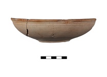 | Description: | About one-third preserved; profile complete. Shallow ring foot; wall rounding to slightly thickened rim with two grooves below lip outside. Rim flat on top; sloping inwards. Concentric grooves around center of floor. Reddish-buff clay, slightly micaceous; thick creamy slip with hard shiny surface, resembling that sometimes seen on lagynoi. Samian A Ware. | |