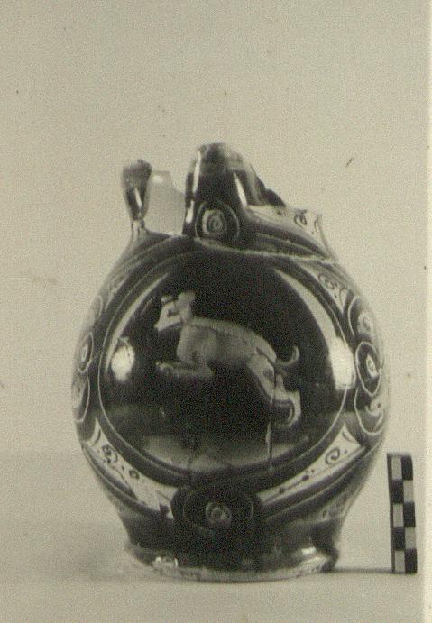 | Description: | Base preserved; most of walls and a fragment of rim; nothing of handle. A bulbous trefoil-lipped pitcher on a slightly spreading flat base. Decoration of lattice-like designs, with scrolls interwoven, in blue and white. On the side is a large medallion, the background dark blue with segments of green and orange. In the center, a brown and white dog, leaping left. On lip and base, green glaze with narrow bands of brown. Inside, glazed with palest bluish-white; outside, transparent glaze over the colors noted. Bottom unglazed, has graffito: <graphic> Coarse light buff clay. | |