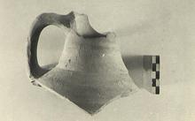 | Description: | Part of neck and shoulders with complete handle preserved; nothing of rim. A large jug. Graffito on either side of shoulder: <graphic> Pinkish-buff clay, unglazed; darker slip. | |