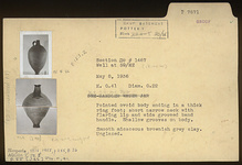 | Description: | Pointed ovoid body ending in a thick ring foot; short narrow neck with flaring lip and wide grooved band handle. Shallow grooves on body. Smooth micaceous brownish-gray clay. Unglazed. | |