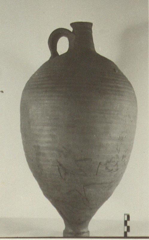 | Description: | Pointed ovoid body ending in a thick ring foot; short narrow neck with flaring lip and wide grooved band handle. Shallow grooves on body. Smooth micaceous brownish-gray clay. Unglazed. | |