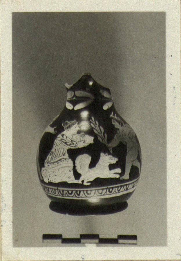 | Description: | Most of trefoil mouth and handle broken away. Ring foot. In the center, a female figure running right, carrying a cake (or cushion?); also running right, a fluffy-tailed dog. On either side, a boy; he to the left carrying a cake, he to the right a laurel branch. Laurel wreath around neck; egg pattern below scene. The girl wears an embroidered long-sleeved jacket over a thin chiton; the boys are nude; the boy on the left has an amulet band over his right shoulder; the one on the right a scarf flying from his right arm. Both wear fillets with white feathers(?). No relief contours. Firm white for girl's dress, flesh and package(?); for the dog, for the feathers of the boys' headdresses, and for the leaves of the wreath. Added clay, with traces of gilding preserved, for the fillets, a dot on the top of the package, and the berries of the wreath. Details over the white added in brown glaze. | |