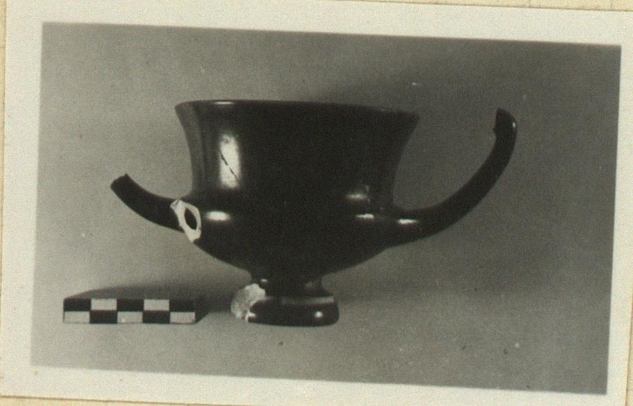 | Description: | Parts of both cup handles missing, also small fragments from walls and chip from base. Restored in plaster. Similar to P 7686, but bigger and deeper; and of finer fabric. Ordinary moulded conical foot; medium high walls with plain flaring lip. At center of floor, four palmettes surrounded by rouletting. Reserved line around foot and on resting surface. Velvety black glaze ADDENDA P 7686: Shallow body; low walls; plain flaring lip. Conical foot, triple grooved. | |