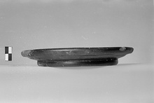 Description:   Chip missing from lip. Restored in plaster. Massive profile. Torus lip. On floor double circle of rouletting with a small incised circle in the middle.