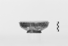 | Description: | Fragments missing from side wall. Deep bowl. Massive base ring. Rim fitted with an outside ledge to receive lid. Thin glaze, mottled red and black. | |