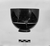 Firm glaze, mottled black and red, scratched from groove around body and at junction of body and base.
