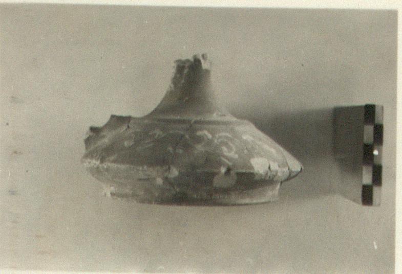| Description: | Mouth, handle and part of wall missing. Flat bottom, sharply angular side wall. Vertical ring handle set on shoulder. Around shoulder, an ivy wreath. | |