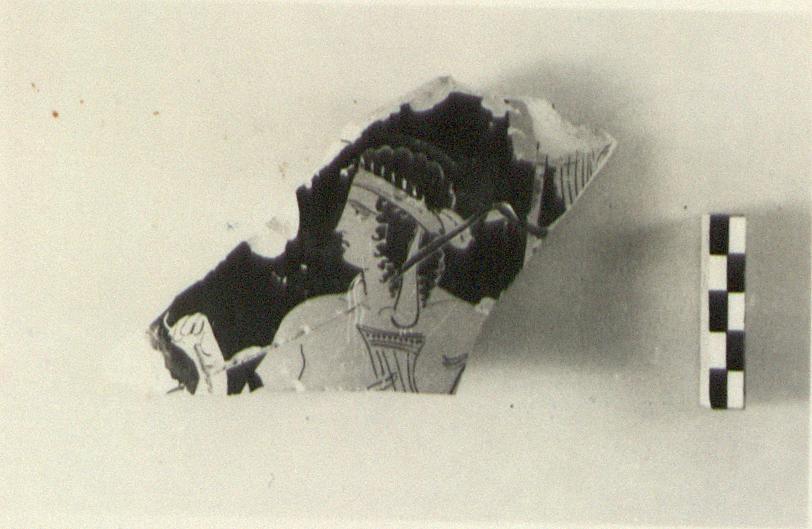 Description:   Wall fragment broken all around. In center, a nude youth looking left holds a horn to his chest in his right hand. He wears long hair bound by a ribbon and a wreath. To the left a female figure holding a fillet; to the right a female figure with staff in right hand. Relief contours for body parts; white for string of fillet and wreath.