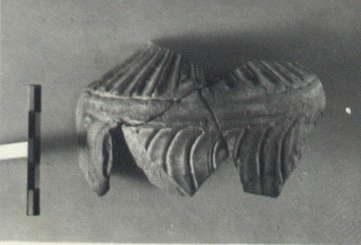 | Description: | Part of side and shoulder preserved with the attachment for a vertical handle. Petal pattern on shoulder. At junction of shoulder and wall, a broad groove. Below, curved petals; irregularly made. Orange-red clay, unglazed. Late Roman. | |