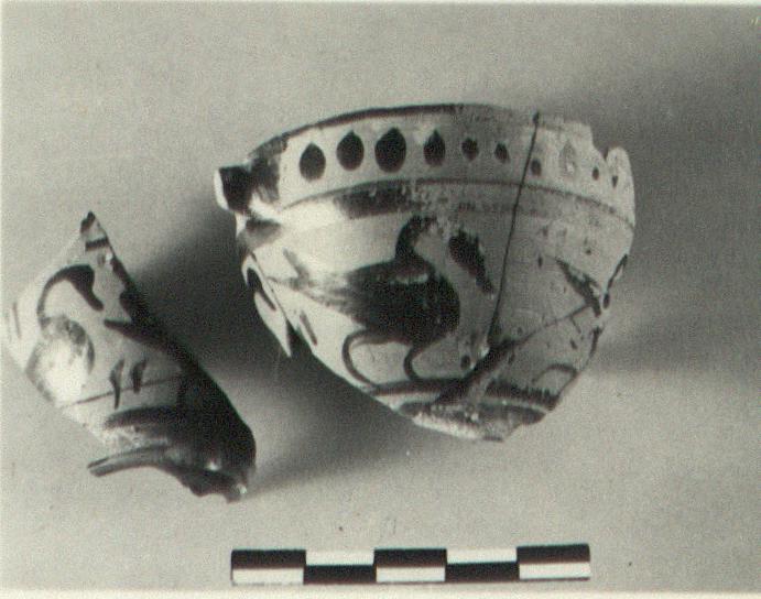| Description: | Fragmentary; about half preserved, mended into two fragments. Procession of geese to right around body; dots on rim. Purple band above foot. No incision. | |