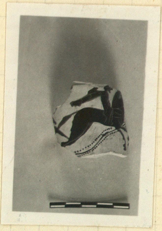 | Description: | From the wall of a small lekythos showing a horseman galloping right, another horse(?) behind. Tendrils in field. Hard creamy white slip; incision; purple details. | |