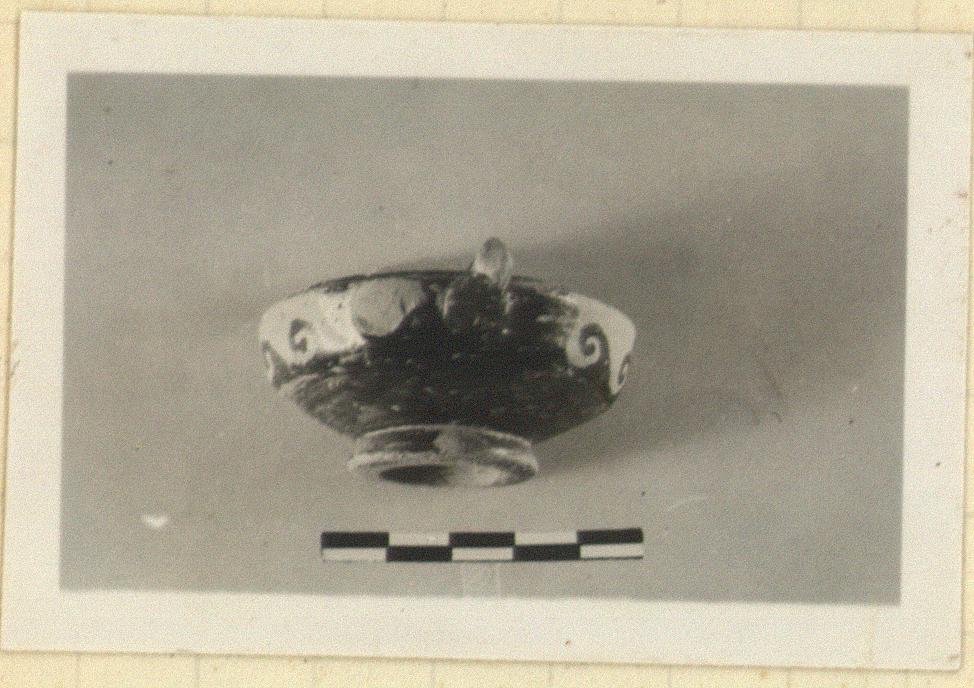 | Description: | Half of body missing and most of one handle. Black glaze inside and out with a wave pattern against a reserved band outside the rim. Rim flanged for a lid. | |