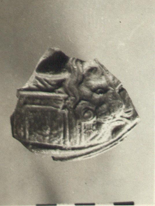 | Description: | Broken all around. Mold made. From the upper front part of a figure wearing an elaborate breastplate; over the left shoulder falls the mask of a lion's skin; eyes punched. At the lower edge of the fragment an air hole(?). Light red clay; purple-red glaze wash outside, and in part inside. Cf. P 5693, form a very similar mould, but more elaborately detailed. Character of glaze suggests that both may be plastic lamps. | |