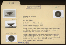 | Description: | Heavy kylix-like base with outer face concave, top flat. Short stem; no handles. Outward projecting rim convex in section. Black glaze except on outer and under face of foot; upper face of rim; and center of floor. In the central reserved space, two circles and a dot; on the rim, five narrow bands. Dull black glaze, burned. | |