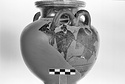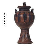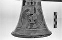| Description: | The lid P 7893 belongs to this lebes. Much missing from the upper part; the stand is intact except for chips, but there is no direct join between it and the body of the base. Nearly half the body is missing, and three-quarters of the neck. Restored in plaster. Projecting lip, with moulded vertical face. The attachments of one upright, horizontal handle preserved. Note in the stand, just below its top, two triangular openings, opposite each other. Cf. Beazley (1931), Pan-Maler, text to no. 83. On base, between bands of inverted rays below and linked buds above, three groups of two women each, seated, facing, on stools, engaged in working wool from baskets. Garments or fillets hang on the wall, and a bird stands, right, on the floor beween two of the groups. On the body (back), a procession of draped women to right, carrying folded packages on their heads. Under the handles, Nike, running right, followed by Hermes with caduceus, then a woman, left, and the heads of two horses. Missing, the wedding procession(?). Around the base of the neck, alternating red and black tongues. Added red and white freely used. | |