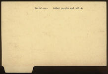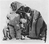 Description:   From the neck of a large volute krater. Good black glaze inside; reserved bevelled edge at front below. In the center a woman stands looking back, wearing an himation decorated with white and purple spots. At right, a leg of a nude man. At left, two advancing horses. Ivy branch hangs down. Careless incision. Added purple and white.