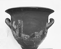| Description: | Two non-joining fragments from a red figured krater. Black inside with reserved band. a) A head left, part of a head at the right, and a hand holding a torch? b) Three heads and parts of torsos. A bit of out-turned rim above with traces of leaf pattern. The surface heavily incrusted with iron corrosion. Relief contours extremely coarse, for the profiles, and much of the other drawing. White for leaves(?) rising from fillets, and for the flame of the torch. Many additional fragments found later and the whole made up in plaster. None of the lip or of the foot remains and the foot as restored is probably a trifle too high. A: Torch racers. Three youths to the left and two to the right of a goal post. Parts of the heads of all are preserved, and much of the bodies, also the torch of the figure at the extreme right. All are nude, and wear fillets from which project large white leaves. Extremely coarse relief contour for the heads and parts of the upper bodies. B: Three cloaked figures; parts of the lower wall only. | |