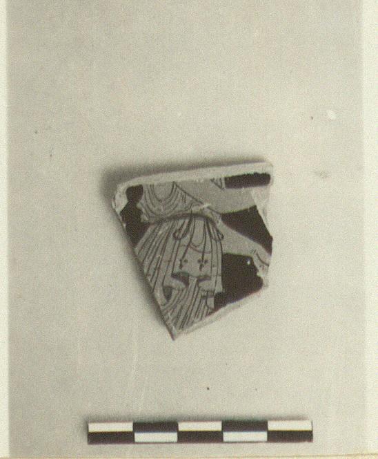 | Description: | From a lekanis lid. Shiny black beneath. A woman standing three-quarters right. She wears a chiton with a long overfold, and girdle tied in front, finished with three raised dots at each end. Note brown shading under edge of overfold. Relief contours. | |