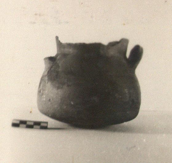 | Description: | One handle missing; much of rim chipped away. Vertical rim with flange for lid. Horizontal handles, vertically turned. Coarse brown ware, gritty and micaceous. | |
